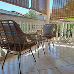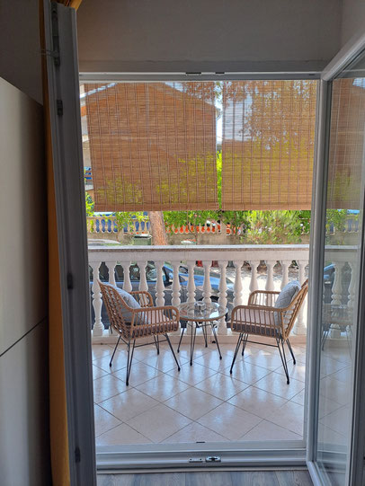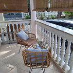 Ausstattung: Doppelbett, Schlafsofa, neue Klimaanlage, Ventilator, W-LAN, Pantryküche mit 2 Kochplatten, Kühlschrank, Senseo Kaffeemaschine, bitte Pads mitbringen, Wasserkocher, Töpfe, Geschirr etc, Badezimmer mit WC und Dusche, Balkon überdacht mit Tisch und Stühlen.