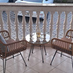 Ausstattung: Doppelbett, Schlafsofa, Klimaanlage, W-LAN, Sat-TV, Pantryküche zwei Kochplatten, Kühlschrank, Senseo Kaffeemaschine, bitte Pads mitbringen, Wasserkocher, Geschirr, Töpfe etc, Badezimmer mit WC und Dusche, schöner Balkon überdacht mit Tisch und Stühlen.